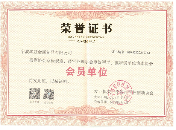 2022年1月5日,經(jīng)寧波市科技創(chuàng)新協(xié)會的審議通過,寧波華航金屬制品有限公司被批準為協(xié)會會員單位。